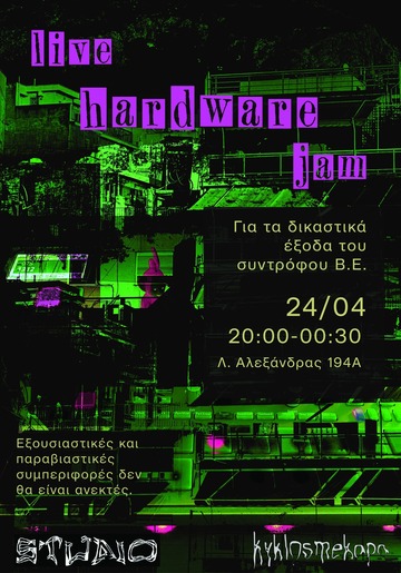 Την Παρασκευή 24/4 συνδιοργανώνουμε με Kyklosmekapa ένα DIY live hardware jam οικονομικής ενίσχυσης στο υπόγειο της Λ. Αλεξάνδρας.