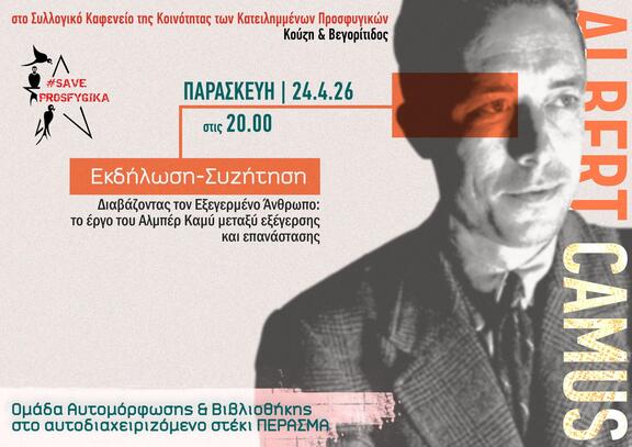 Παρασκευή 24/4 στις 20:00 στο συλλογικό καφενείο της Κοινότητας Κατειλημμένων Προσφυγικών θα πραγματοποιηθεί η Εκδήλωση- Συζήτηση "Διαβάζοντας τον Εξεγερμένο Άνθρωπο: το έργο του Αλμπέρ Καμύ μεταξύ εξέγερσης και επανάστασης"