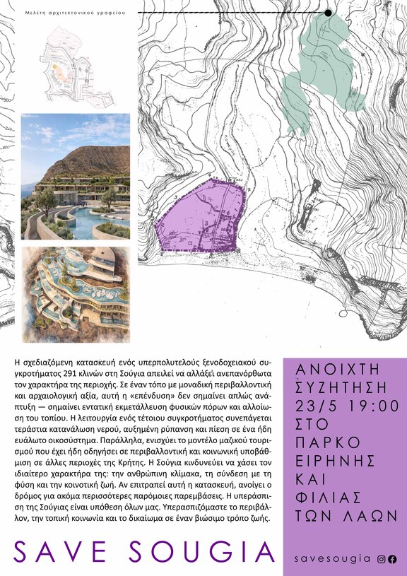Η ανέγερση ενός υπερπολυτελούς ξενοδοχειακού συγκροτήματος 291 κλινών στη Σούγια, από την ΚΛΕΙΝΑΚΗΣ ΙΩΑΝΝΗΣ και ΣΙΑ Α.Ε., βρίσκεται πλέον στο στάδιο της προέγκρισης οικοδομικής άδειας, παίρνοντας το πράσινο φως από την Υπηρεσία Δόμησης Χανίων. Η σχεδιαζόμενη κατασκευή, βρίσκεται σε μια περιοχή με ιδιαίτερη περιβαλλοντική και αρχαιολογική σημασία και δεν αποτελεί απλώς μια ακόμη «επένδυση». Πρόκειται για μια βαθιά μεταβολή του τόπου, που επηρεάζει ανεπανόρθωτα, τόσο το περιβάλλον όσο και εμάς τα ίδια, και τον τρόπο διαβίωσής μας.