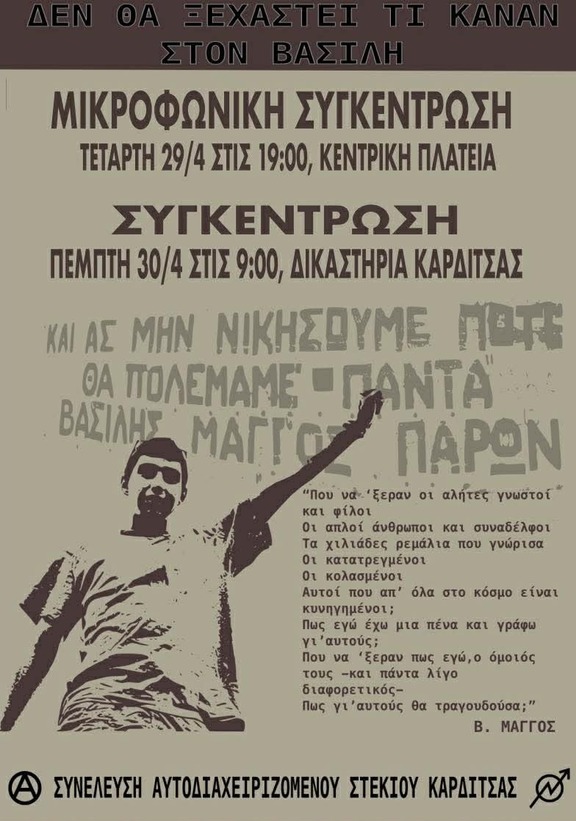 Την Τετάρτη 29/04/'26 στις 19:00 μικροφωνική συγκέντρωση στην κεντρική πλατεία Καρδίτσας και την Πέμπτη 30/04/'26 στις 09:00 όλοι και όλες στα δικαστήρια Καρδίτσας για την συνέχεια της δίκης των ένστολων μισθοφορικών καθαρμάτων του κράτους και βασανιστών του Αναρχικού Βασίλη Μάγγου. Δίκη που ξεκίνησε τυπικά μετά από συνεχόμενες αναβολές και διακοπές την Πέμπτη 02/04/'26 με την εκλογή των ενόρκων και συνεχίστηκε την Τρίτη 07/04/'26 με το δικαστήριο να απορρίπτει το αίτημα της οικογενείας για δικαίωμα παράστασης προς υποστήριξη της κατηγορίας και την κρίση επί μιας ένστασης που υπέβαλε η πλευρά των συνηγόρων, με βάση την οποία η διπλή ιδιότητα μάρτυρα και κατηγορούμενου ενός εκ των κατηγορουμένων δεν θεραπεύεται με την απλή εξαίρεση των μαρτυρικών του καταθέσεων, αλλά απαιτεί αλλαγή σύνθεσης. Δεν περιμένουμε και τίποτα καλύτερο από την αστική δικαιοσύνη τους ,όμως ο αγώνας συνεχίζεται. Και ας μη νικήσουμε ποτέ θα πολεμάμε πάντα!