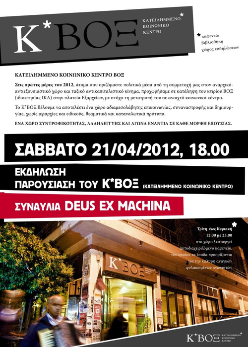 Στις πρώτες μέρες του 2012, άτομα που οριζόμαστε πολιτικά μέσα από τη συμμετοχή μας στον αναρχικό-αντιεξουσιαστικό χώρο και ταξικό αντικαπιταλιστικό κίνημα, προχωρήσαμε σε κατάληψη του κτιρίου ΒΟΞ (ιδιοκτησίας ΙΚΑ) στην πλατεία Εξαρχείων, με στόχο τη μετατροπή του σε ανοιχτό κοινωνικό κέντρο