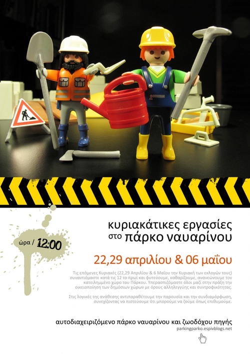 Τις 3 επόμενες Κυριακές (22,29 Απριλίου και 6 Μαΐου, την Κυριακή των εκλογών τους) συναντιόμαστε κατά τις 12 το πρωί και φυτεύουμε, καθαρίζουμε, ανανεώνουμε τον κατειλημμένο χώρο του Πάρκου. Υπερασπιζόμαστε όλοι μαζί στην πράξη την οικειοποίηση των δημόσιων χώρων με όρους αλληλεγγύης και συντροφικότητας.