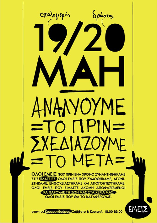 (Eπειδή ανεξάρτητα απο το αποτέλεσμα των εκλογών ο κόσμος πρέπει να είναι σε εγρήγορση και στο δρόμο και να συμμετέχει ενεργά στις εξελίξεις, μαζευόμαστε και συζητάμε για το πως πορευόμαστε από δω και πέρα...