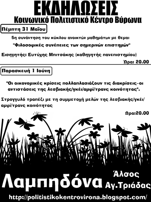 ΠΡΟΓΡΑΜΜΑ ΕΚΔΗΛΩΣΕΩΝ ΚΟΙΝΩΝΙΚΟΥ ΠΟΛΙΤΙΣΤΙΚΟΥ ΚΕΝΤΡΟΥ 29/5 - 3/6Τρίτη 29/5 στις 8μμ ραντεβού για αφισοκόλληση των εκδηλωσεων της εβδομαδας