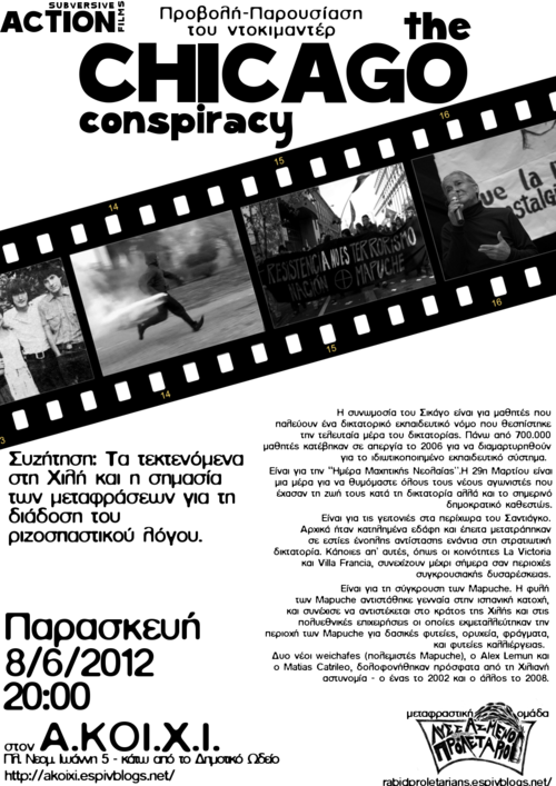 Προβολή του ντοκιμαντέρ «Τhe Chicago Cοnspiracy» & Συζήτηση για τα τεκταινόμενα στη Χιλή και την σημασία των μεταφράσεων για τη διάδοση του ριζοσπαστικού λόγου.