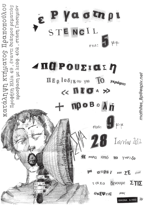 Ξεκινάμε στις 17:00 με εργαστήρι στενσιλ, στις 21:00 θα παρουσιαστεί το περιοδικό "Πίσα" και θα ακολουθήσει προβολή του ντοκυμαντές "unlike you, trainwritting in berlin".