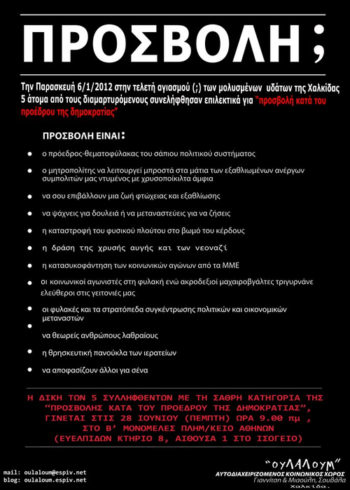 Πριν πέντε μήνες στην πόλη της Χαλκίδας την ημέρα των ''Θεοφανείων'' συνελήφθησαν από την αστυνομία πέντε άτομα. Η κατηγορία που τους απήγγειλε ο εισαγγελέας ήταν για «προσβολή κατά του προσώπου του προέδρου της δημοκρατίας » καθώς οι συνθήκες σύλληψης αφορούσαν τις διαμαρτυρίες του συγκεντρωμένου πλήθους που προκλήθηκαν από την παρουσία του Παπούλια και του υπουργού Γιαννίτση στο επίσημο καθιερωμένο δρώμενο. Πέντε άτομα στοχοποιήθηκαν - για να αποσιωπηθεί το γεγονός ότι όλος ο παρευρισκόμενος κόσμος διαμαρτυρόταν- με τη δικαιολογία ότι φώναζαν συνθήματα όπως «Λαέ πεινάς γιατί τους προσκυνάς», «Ψωμί, παιδεία, ελευθερία η χούντα δεν τελείωσε το '73» και ορίστηκε αυτεπάγγελτα δικάσιμη για τις 30 Μαρτίου. Η δίκη αυτή δεν έγινε καθώς, δυο μέρες πριν, οι κατηγορούμενοι ενημερώθηκαν για μεταφορά του τόπου διεξαγωγής της δίκης στην Αθήνα, με την αιτιολογία ότι «συντρέχουν λόγοι για τη δημόσια ασφάλεια και τάξη…». Είναι γεγονός ότι η έκφραση αλληλεγγύης κλονίζει τα θεμέλια της εξουσίας καθώς μεσολάβησαν μια πορεία και μια συναυλία αλληλεγγύης σε αυτά τα άτομα που απλώς διαμαρτυρήθηκαν με κάποια πολιτικά συνθήματα. Αυτές οι φασιστικού τύπου συλλήψεις αποδεικνύουν περίτρανα την αλήθεια αυτών των συνθημάτων. Στην ουσία, προσπαθούν να να ενοχοποιήσουν κάθε επιθυμία αντίστασης, κριτικής και αμφισβήτησης και να φιμώσουν το λόγο για να ανακόψουν τις απελευθερωτικές πράξεις που μπορεί να εμπνεύσει. Επίσης, δηλώνουν τις προθέσεις μιας εξουσίας που προσπαθεί να πείσει ότι δεν γίνεται καν να μιλάς ελεύθερα ως συνειδητοποιημένο άτομο που κάνει λογικές εκτιμήσεις της πραγματικότητας. Και ακόμη περισσότερο να πείσει ότι όλες αυτές οι λεκτικές και μόνο διαπιστώσεις θα διαταράξουν την κοινωνική ειρήνη στην πόλη…Οι άρχοντές μας για να νομιμοποιήσουν τις πράξεις τους δεν διστάζουν να καταργήσουν με κυνισμό κάθε επίφαση δημοκρατίας και ελευθερίας, να αποδείξουν ότι η δημοκρατία και η ελευθερία δεν είναι παρά κούφιες λέξεις που μεταμφιέζουν ένα ολιγαρχικό και απάνθρωπο καθεστώς. Το ζητούμενο είναι να αθωωθεί, με τρόπο θεαματικό και με μέτρα απροκάλυπτα αυταρχικά και ολοκληρωτικά, μια πολιτική που γεννάει το έγκλημα, που προκρίνει το κέρδος, που πολλαπλασιάζει τα γκέτο πλουσίων και φτωχών, που συντηρεί μια εκπαίδευση στρατοπέδου συγκεντρώσεως, που επιταχύνει την υλική και πνευματική ένδεια, που υποδαυλίζει τον κυνισμό και τον ωχαδερφισμό της απελπισίας.