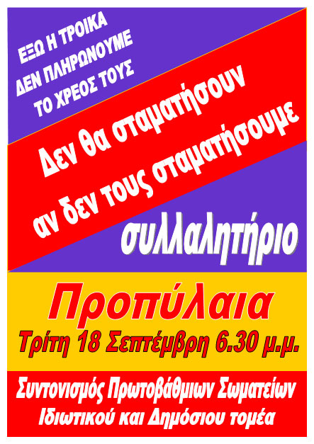 Οι εργαζόμενοι, οι νέοι, οι άνεργοι πρέπει να πάρουμε την υπόθεση στα χέρια μας, κάνοντας όλες τις απαραίτητες τομές για να νικήσουν οι αγώνες. Αυτό απαιτεί μια άλλη κατάσταση στο εργατικό -συνδικαλιστικό κίνημα, με υπέρβαση του υποταγμένου συνδικαλισμού, με αλλαγή των συσχετισμών. Με ενωτική προσπάθεια στη βάση, στα πρωτοβάθμια σωματεία και τους συλλόγους, με διαδικασίες άμεσης δημοκρατίας, με οριζόντιο συντονισμό των συνδικάτων, με αποφασιστικές μορφές πάλης, με συσπείρωση των ανέργων και των ελαστικά εργαζόμενων.