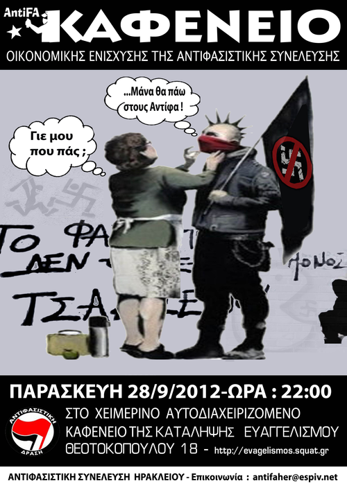 Καφενείο για την οικονομική ενίσχυση της αντιφασιστικής συνέλευσης Ηρακλείου στο Χειμερινό Aυτοδιαχειριζόμενο καφενείο της Κατάληψης Ευαγγελισμού την Παρασκευή 28/9/12 - ώρα : 22:00 - ( Επικοινωνία :antifaher@espiv.net )