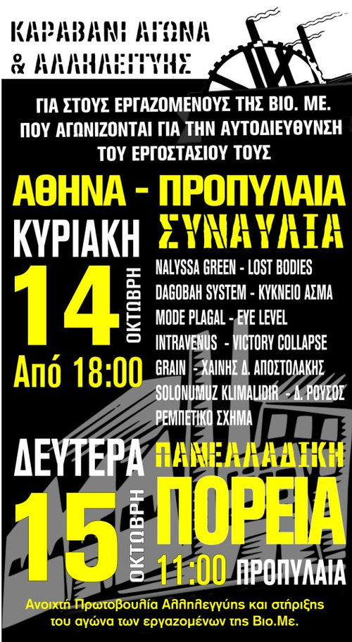 Την στιγμή που οι άνεργοι πλησιάζουν τα 2 εκατομμύρια, που οι επιχειρήσεις κλείνουν η μία μετά την άλλη, που το κράτος οργανώνει διαρκείς φοροεπιδρομές εις βάρος των εργαζομένων, ο αγώνας για την κατάληψη και την αυτοδιαχείριση των μέσων παραγωγής συνολικά πρέπει να γίνει αγώνας κάθε σωματείου, κάθε εργαζομένου και κάθε ανέργου. Καλούμε κάθε ταξικό, αγωνιστικό σωματείο, κάθε άνεργο και εργαζόμενο, να στηρίξει και να δείξει την αλληλεγγύη του στον αγώνα της ΒΙΟΜΕ, να παλέψει μαζί μας καταρχήν με τη συμμετοχή του στο ΚΑΡΑΒΑΝΙ ΑΓΩΝΑ ΚΑΙ ΑΛΛΗΛΕΓΓΥΗΣ, στη συμμετοχή του στις πολύπλευρες δράσεις του σε όλη τη χώρα και στη πανελλαδική του κατάληξη με διαδήλωση στην Αθήνα στις 15/10.