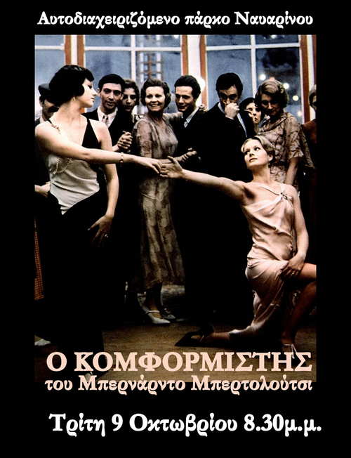 Την Τρίτη 9 Οκτωβρίου στις 8.30μ.μ. το Αυτοδιαχειριζόμενο πάρκο Ναυαρίνου σας καλεί στην προβολή της ταινίας IL CONFORMISTA-Ο ΚΟΜΦΟΡΜΙΣΤΗΣ του Μπερνάρντο Μπερτολούτσι.
