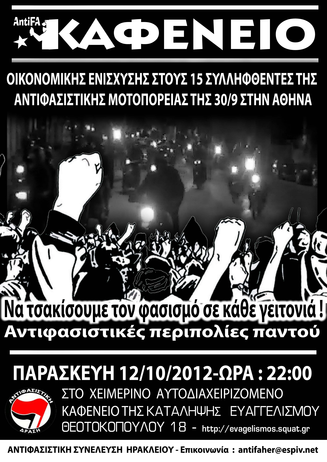 Παρασκευή 12/10/12 - ώρα : 22:00 - στο Χειμερινό Aυτοδιαχειριζόμενο καφενείο της Κατάληψης Ευαγγελισμού. ( Επικοινωνία : antifaher@espiv.net ) -Αντιφασιστική συνέλευση Ηρακλείου