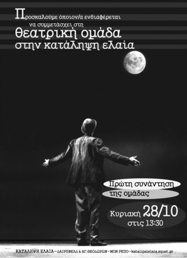 Όποιος ενδιαφέρεται να συμμετάσχει στη θεατρική ομάδα, μπορεί να έρθει στην πρώτη συνάντηση την Κυριακή 28/10 στις 13:30 στην Ελαία.