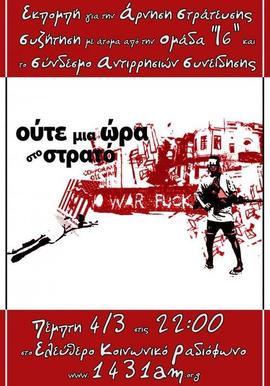 Εκπομπή με θέμα την άρνηση στράτευσης και θα συμμετέχουν άτομα από την ομάδα Ι6 και το Σύνδεσμο Αντιρρησιών Συνείδησης.