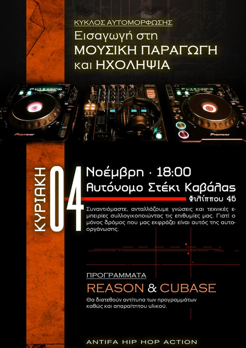Την Κυριακή 4 Νοέμβρη θα πραγματοποιηθεί η πρώτη συνάντηση ενός κύκλου αυτομόρφωσης πάνω στη μουσική παραγωγή και ηχοληψία. Με αυτοοργανωμένες διαδικασίες συλλογικοποιούμε τις ανάγκες μας και τις επιθυμίες μας, ανταλλάζοντας γνώσεις, τεχνικές εμπειρίες και υλικό. Σκοπός αυτής της πρωτοβουλίας είναι να δωθεί η δυνατότητα σε όποιον θέλει να μάθει τα βασικά σχετικά με τη μουσική παραγωγή και την ηχοληψία σε software. Επειδή η όλη διαδικασία είναι αυτοοργανωμένη, λογικές όπως αυτή της αυθεντίας και του ανταγωνισμού δεν έχουν καμία θέση.