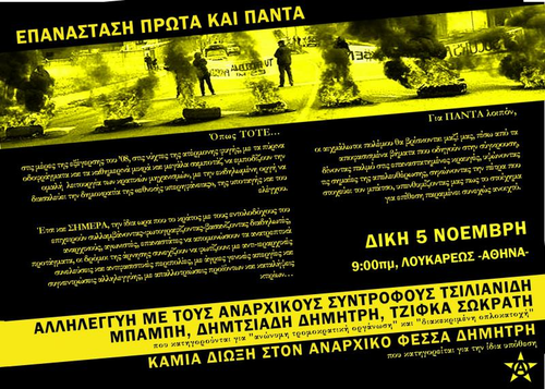 Έτσι και ΣΗΜΕΡΑ, την ίδια ώρα που το κράτος με τους εντολοδόχους του επιχειρούν συλλαμβάνοντας-φωτογραφίζοντας-βασανίζοντας διαδηλωτές, αναρχικούς, αγωνιστές, επαναστάτες να απομονώσουν τα ανατρεπτικά προτάγματα, οι δρόμοι της άρνησης συνεχίζουν να φωτίζουν: με αντι-ιεραρχικές συνελεύσεις και αντιφασιστικές περιπολίες, με άγριες γενικές απεργίες και συγκεντρώσεις αλληλεγγύης, με απαλλοτριώσεις προϊόντων και καταλήψεις κτιρίων…