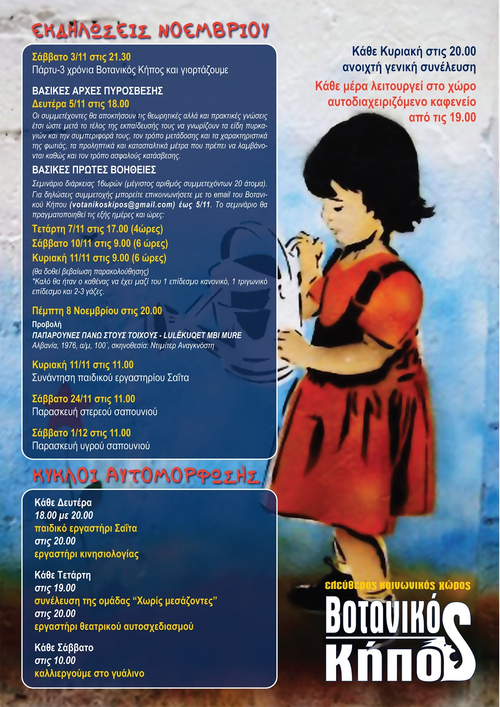 Για δηλώσεις συμμετοχής μπορείτε επικοινωνήσετε με το email του Βοτανικού Κήπου (votanikoskipos@gmail.com) έως 5/11.