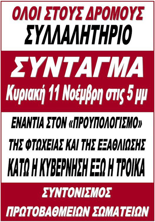 ΟΛΟΙ ΣΤΟ ΣΥΛΛΑΛΗΤΗΡΙΟ ΤΗΝ ΚΥΡΙΑΚΗ 11/11 ΣΤΙΣ 5 μμ ΣΤΟ ΣΥΝΤΑΓΜΑ (ΟΘΩΝΟΣ ΚΑΙ ΑΜΑΛΙΑΣ) ΕΝΑΝΤΙΑ ΣΤΟΝ ΠΡΟΫΠΟΛΟΓΙΣΜΟ ΤΗΣ ΦΤΩΧΕΙΑΣ ΚΑΙ ΤΗΣ ΕΞΑΘΛΙΩΣΗΣ