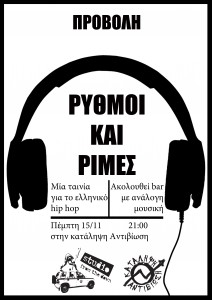 Προβολή του "Ρυθμοί και ρίμες", μια ταινία για το ελληνικό hip-hop. Θα ακολουθήσει bar με ανάλογη μουσική. Την Πέμπτη 15 Νοεμβρίου στις 21:00 στην κατάληψη Αντιβίωση από το Studio from the Down