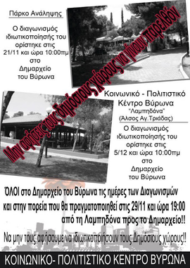 · Παράσταση διαμαρτυρίας και ακύρωση του διαγωνισμού για την εκμίσθωση του αναψυκτηρίου της Λαμπηδόνας Τετάρτη 5/12 ώρα 8.30 πμ μπροστά από το Δημαρχείο Βύρωνα.