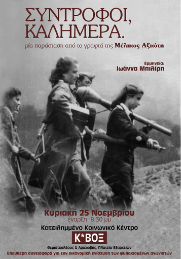 Το κατειλημμένο κοινωνικό κέντρο Κ*Βοξ σάς προσκαλεί στη θεατρική παράσταση ΣΥΝΤΡΟΦΟΙ, ΚΑΛΗΜΕΡΑ που βασίζεται σε κείμενα της Μέλπως Αξιώτη, την Κυριακή, 25/11 στις 20.30.