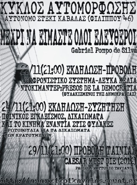 Τέλος μέσα από αυτό τον κύκλο θα προσπαθήσουμε να καταρρίψουμε κάποιους μύθους σχετικά με το ρόλο της φυλακής η οποία λανθασμένα παρουσιάζεται ως χώρος αναμόρφωσης εγκληματιών, ενώ αντίθετα είναι ο θεσμός που διδάσκει στους φυλακισμένους το έγκλημα, που διαχωρίζει και διασπά το κοινωνικό σύνολο, που χρησιμοποιείται ως ανασταλτικός παράγοντας στην ανάπτυξη δικτύων και αγώνων ενάντια στο κράτος και ως τόπος εναπόθεσης αυτών που περισσεύουν.