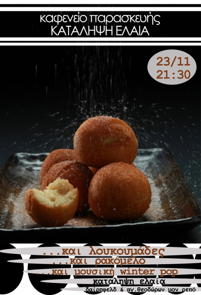 Την Παρασκευή 23/11 στις 21:30 στο καφενείο μας θα φτιάξουμε λουκουμάδες, ρακόμελο και όλα αυτά υπό τα ακούσματα Winter Pop μουσικής.
