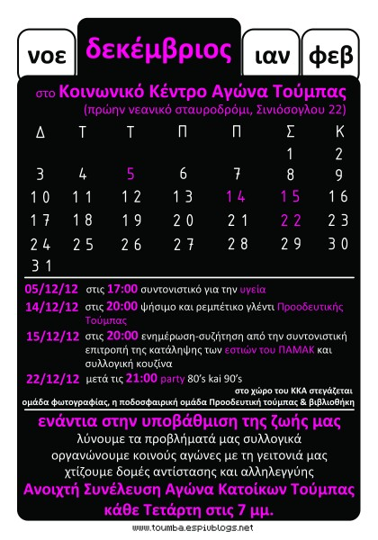 Κοινωνικό Κέντρο Αγώνα Τούμπας Στέκι Προοδευτικής Έκρηξης Τούμπας (κατάληψη Σινιόσογλου 22, Κάτω Τούμπα) λεωφορεία 10,58: στάση "Γραφεία ΟΑΣΘ" λεωφορείο 11: στάση "Μπότσαρη"