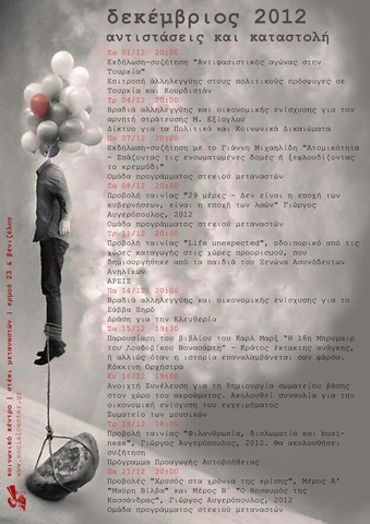 Εκδηλώσεις, προβολές ταινιών, βιβλιοπαρουσιάσεις διοργανώνονται τον Δεκέμβρη στο Κοινωνικό Κέντρο- Στέκι Μεταναστών τον Δεκέμβρη