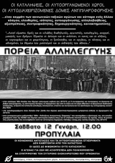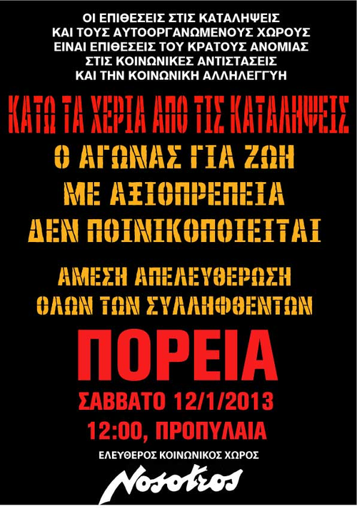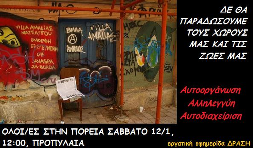 Το Σάββατο 12/1 στις 12 στα Προπύλαια θα πραγματοποιηθεί πορεία αλληλεγγύης στις καταλήψεις, τους αυτοοργανωμένους χώρους και τις αυτοδιαχειριζόμενες δομές αντιπληροφόρησης.