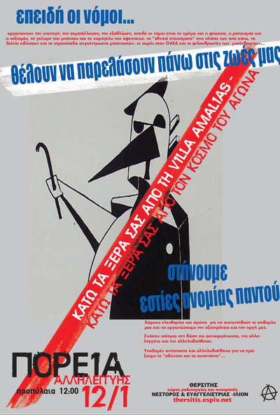 Αλληλεγγύη στη Villa Amalias, στο αυτοδιαχειριζόμενο στέκι Xanadu, στα πολιτικά στέκια της ΑΣΣΟΕ και στους συλληφθέντες μετανάστες μικροπωλητές, στον 98fm, στην κατάληψη Πατησίων & Σκαραμαγκά και σε όλους τους στοχοποιημένους χώρους, σε όλους τους συλληφθέντες και διωκόμενους αγωνιστές των καταλήψεων και των κινήσεων αλληλεγγύης.