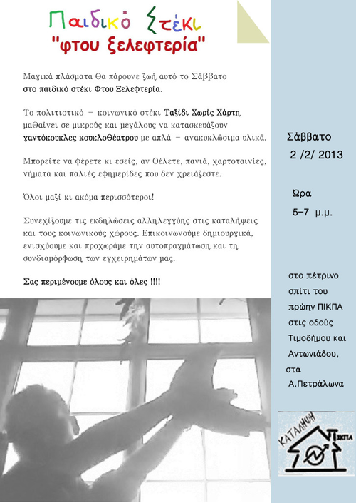 Αυτό το Σάββατο στις 17.00 θα επισκεφθούμε την κατάληψη Πικπα στα Άνω Πετράλωνα και το παιδικό στέκι Φτου Ξελεφτερία, για να φτιάξουμε όλοι μαζί γαντόκουκλες κουκλοθεάτρου με απλά ανακυκλώσιμα υλικά! (Τέτοιες "ανομίες" πρό- κειται να λάβουν χώρα λοιπόν... )