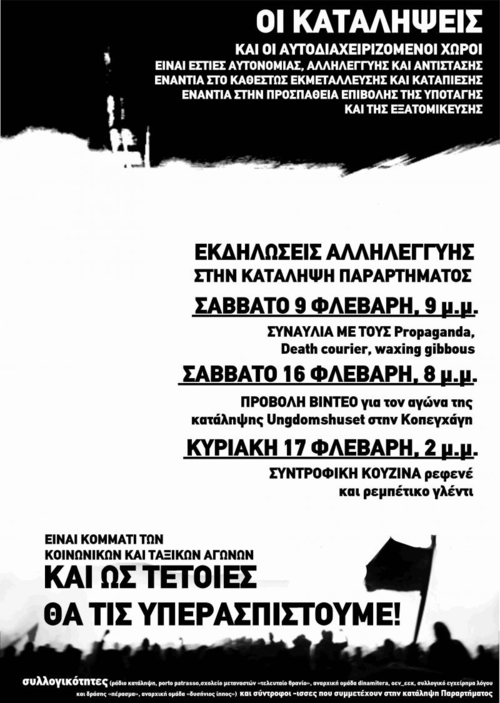 συλλογικότητες (ράδιο κατάληψη, porto patrasso,σχολείο μεταναστών «τελευταίο θρανίο», αναρχική ομάδα dinamitera, οεν_εεκ, συλλογικό εγχείρημα λόγου και δράσης «πέρασμα», αναρχική ομάδα «δυσήνιος ίππος») και σύντροφοι -ισσες που συμμετέχουν στην κατάληψη Παραρτήματος