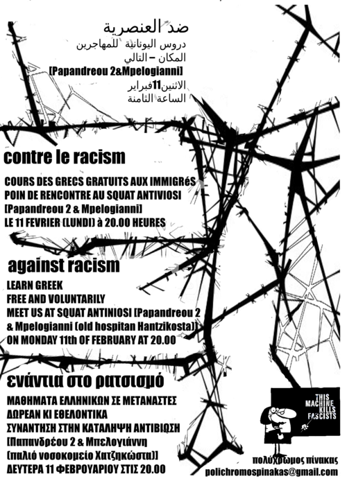 Η συλλογικότητα "Πολύχρωμος Πίνακας" καλεί την δευτέρα 11 Φεβρουαρίου στις 20.00 στην κατάληψη Αντιβίωση [Παπανδρέου 2 & Μπελογιάννη (παλιό νοσοκομείο Χατζηκώστα)] μετανάστες και μετανάστριες που θέλουν να διδαχθούν την Ελληνική γλώσσα.