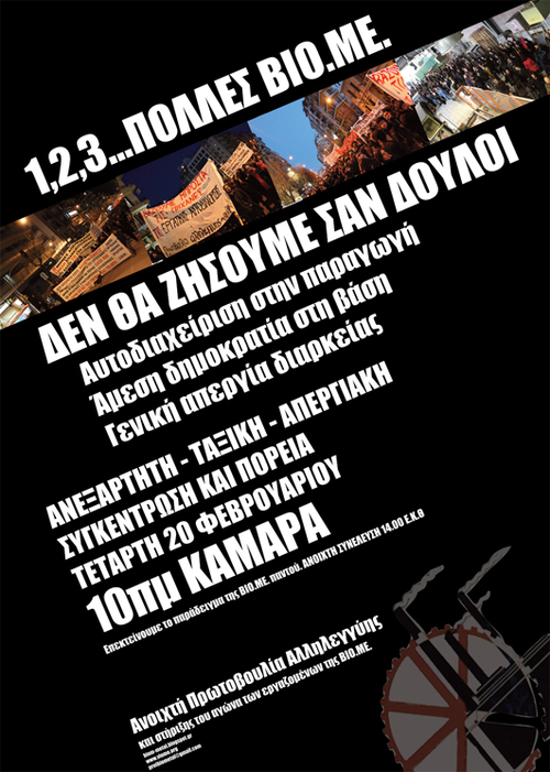 Οι εργαζόμενοι της Βιομηχανικής Μεταλλευτικής μετά από πτώχευση της ιδιοκτήτριας εταιρείας και την παύση πληρωμών τους, αποφάσισαν να αναλάβουν οι ίδιοι την διαχείριση της παραγωγής του εργοστασίου. Παρά το γεγονός ότι το εργοστάσιο ήταν εγκαταλελειμμένο από τον Μάϊο του 2011 οι εργαζόμενοι κόντρα σε αφεντικά και συνδικαλιστικές ηγεσίες, με όπλο την αυτοοργάνωση του αγώνα τους, ξεκίνησαν πανελλαδικό καραβάνι αλληλεγγύης, το οποίο συσπείρωσε πλήθος αλληλέγγυων πάνω στο ζήτημα της αυτοδιαχείρισης στην παραγωγή. Ενάντια στις γραφειοκρατικές-ιεραρχικές δομές της αγοράς-εργασίας και στην λογική της κερδοφορίας που θέλει επιχειρήσεις να βάζουν λουκέτα και εργαζόμενοι να απολύονται στο όνομα της μη ανταγωνιστικότητας, η επιλογή των ανθρώπων της ΒΙΟΜΕ για αυτοδιεύθυνση ξεκινάει από την βάση, δηλαδή από τους ίδιους τους εργαζόμενους. Ακόμη με τα αμεσοδημοκρατικά χαρακτηριστικά που προσλαμβάνει ο αγώνας τους φέρει πλέον στο επίκεντρο της συζήτησης τις δικές τους ανάγκες και δείχνει τον δρόμο για μια συμμετοχική οικονομία των αναγκών της κοινωνίας.