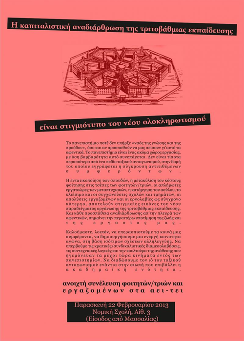 Εδώ και περίπου ένα μήνα, συλλογικότητες, φοιτητές-τριες και εργαζόμενοι/ες των ΑΕΙ-ΤΕΙ στην Αθήνα, αντιλαμβανόμενοι-ες τις παραπάνω προβληματικές του ταξικού ανταγωνισμού μέσα στο πανεπιστήμιο, συζητήσαμε και πήραμε τη πρωτοβουλία για τη συγκρότηση μιας συνέλευσης ενάντια στην καπιταλιστική αναδιάρθρωση της τριτοβάθμιας εκπαίδευσης.
