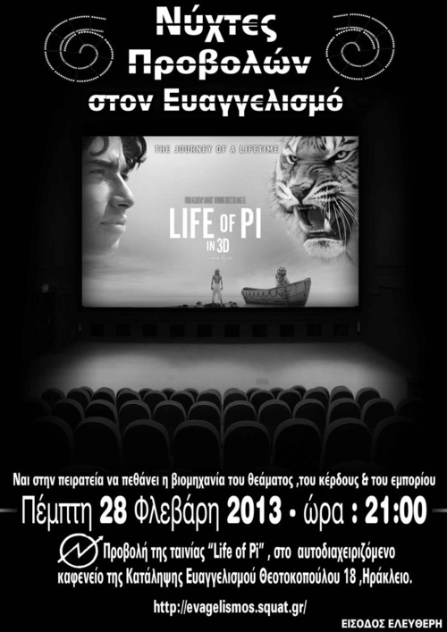 - Προβολή της ταινίας "Life of Pi" , στο αυτοδιαχειριζόμενο καφενείο της