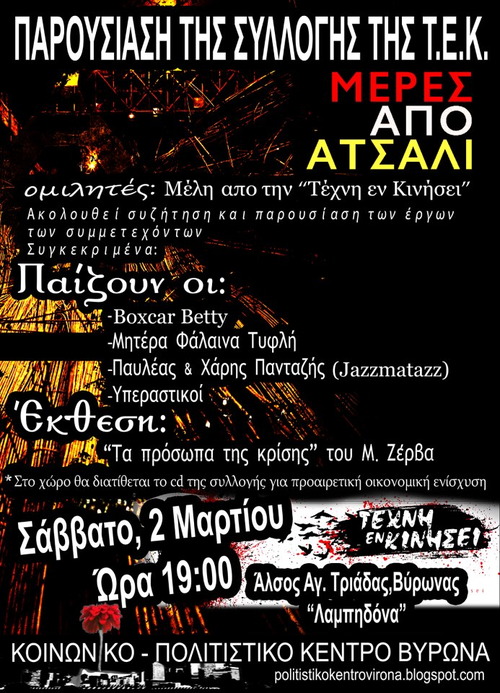 Το Σάββατο 2 Μαρτίου στις 7.30 μμ το Κοινωνικό Πολιτιστικό Κέντρο Βύρωνα παρουσιάζει στη Λαμπηδόνα (άλσος Αγίας Τριάδας), τη συλλογή της ΤΕΚ "Μέρες από ατσάλι". Τις αρχικές τοποθετήσεις θα τις κάνουν μέλη της ΤΕΚ. Θα ακολουθήσει συζήτηση και μετά συναυλία με τους: