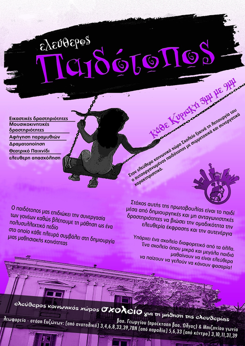 "Σχολείο για τη Μάθηση της Ελευθερίας" Ελεύθερος Κοινωνικός Χώρος (πρώην 12ο Δημοτικό Σχολείο Θεσσαλονίκης) Βασ. Γεωργίου με Μπιζανίου λεωφορεία 3,5,6,7,8,10,11,31,33,39,58 στάση ΕΥΖΩΝΩΝ (περιοχή Φάληρο)