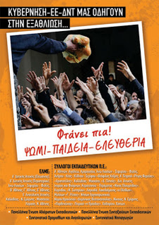 Τα σχολεία πεινάνε και κρυώνουν. Χιλιάδες παιδιά περνούν τις πόρτες τους πεινασμένα εξαιτίας της καπιταλιστικής κρίσης, της φτώχειας και της ανεργίας. Εκατοντάδες σχολεία δεν έχουν ούτε δεκάρα στα ταμεία τους. Διεκδικούμε συσσίτια για τα παιδιά, πετρέλαιο και αύξηση της κρατικής χρηματοδότησης για τα σχολεία μας.