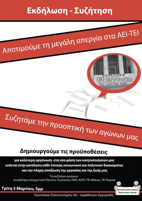 Σας καλούμε να συμμετέχετε στην εκδήλωση-συζήτηση που διοργανώνουμε την Τρίτη, 5 Μαρτίου, 5μ.μ., στα Προπύλαια (Αμφιθέατρο Αργυριάδη), με θέμα «Εμπειρία και προοπτική των αγώνων στα ΑΕΙ-ΤΕΙ ενάντια στην πολιτική απαξίωσης της εργασίας και της ζωής μας».