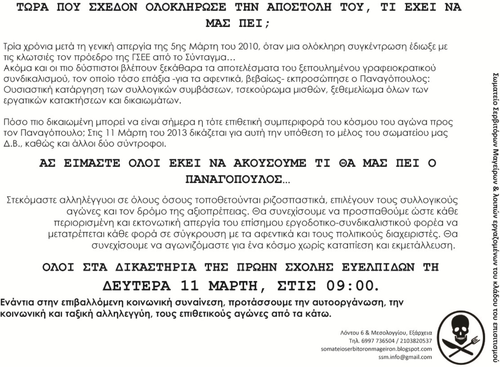 Στις 11 Μαρτίου του 2013 (μετά απο αναβολή της δίκης, στις 4 Απριλίου 2012, επειδή δεν εμφανίστηκε κανείς απο τους εργατοπατέρες της ΓΣΕΕ και της ΑΔΕΔΥ, οι οποίοι είναι οι μάρτυρες κατηγορίας) οι Ν.Μ., Δ.Β. και Κ.Π. καλούμαστε ξανά στα δικαστήρια της πρώην σχολής Ευελπίδων να δικαστούμε για την εκδίωξη του επαγγελματία εργατοπατέρα, επίδοξου βουλευτή και υπάλληλου του ΣΕΒ Παναγόπουλου από την απεργιακή συγκέντρωση που πραγματοποιήθηκε στις 5 Μαρτίου 2010 στο Σύνταγμα.