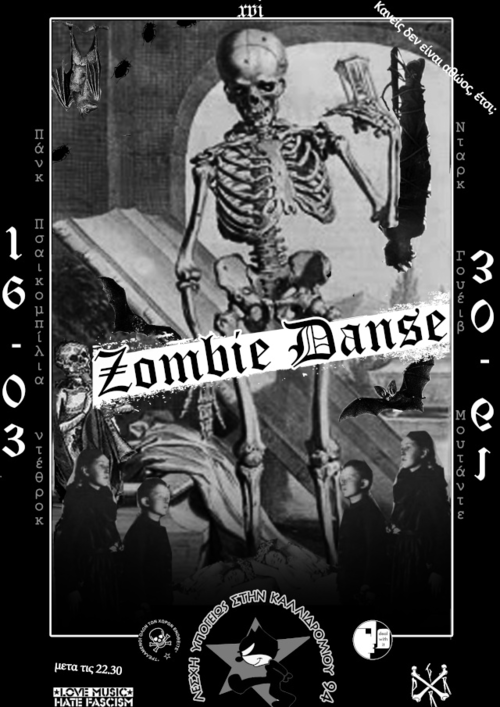 Tο Σάββατο 16-03 οργανώνουμε το μηνιαίο μας πια zombie dance.. Όπως πάντα ανοιχτό σε όλους, με ελεύθερη είσοδο και όντως φτηνές τιμές στο μπαρ. Και αυτή τη φορά, όπως και πάντα, είναι ανοιχτό το κάλεσμα για όποιον/α θέλει να συμμετέχει στην ομάδα, είτε να έρθει σε συνενόηση μεταξύ μας για να παίξει εκείνος/η μαζί μας την επόμενη φορά μουσική, είτε να μπει στο κοινό φόρουμ (λινκ και δεξιά και στο τέλος των κειμενων) όπου σαν κοινότητα συζητάμε τα πράγματα και ορίζουμε συναντήσεις. Τυχαίνει και πέφτει πάνω στη μέρα που παίζουν οι αγαπημένοι Kalashnikov από Ιταλία και Bernays Propaganda από Μακεδονία για τα 23 χρόνια βίλλας, θα πάμε κι εκεί, και κάποιοι λίγο πιο νωρίς- κάποιοι λίγο πιο αργά θα είμαστε και στη λέσχη. Επειδή πλέον δε μπορούμε να αρκεστούμε στη σιωπή με όσα γίνονται γύρω μας, και απλά να κοιτάμε τα παρτυ μας, γράφτηκε και ένα κείμενο να υπάρχει στο χώρο με αφορμή πράγματα που βλέπουμε να συμβαίνουν. Εσύ τι έκανες για τη μουσική που αγαπάς σήμερα;