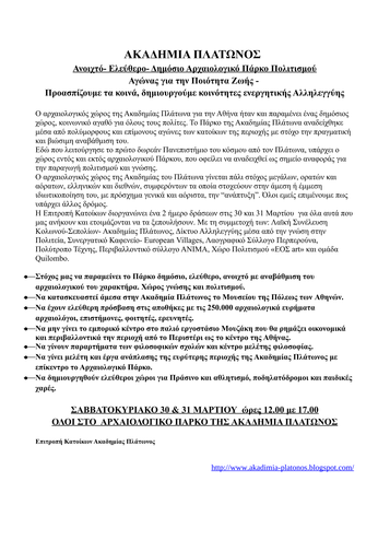 Εάν το πάρκο Ακαδημίας Πλάτωνα ξεπουληθεί , μπορεί να μην καταφέρουμε να ξαναβρεθούμε εκεί όλοι μαζί . Ας διεκδικήσουμε να φροντιστεί και να παραμείνει ελέυθερος χώρο ς..