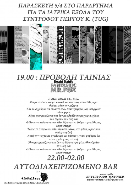 Την Παρασκευή 5/4/2013 θα πραγματοποιηθεί εκδήλωση οικονομικής ενίσχυσης για τα ιατρικά έξοδα του φίλου και συντρόφου Γιώργου Κ. (Tug) στην Κατάληψη Παραρτήματος (Κορίνθου & Αράτου), Πάτρα.
