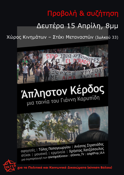 Το Δίκτυο για τα Πολιτικά και Κοινωνικά Δικαιώματα την Δευτέρα 15 Απρίλη, στις 8μμ, στο Χώρο Κινημάτων - Στέκι Μεταναστών (Ιωλκού 33, Βόλος) διοργανώνει εκδήλωση με θέμα τους αγώνες των τοπικών κοινωνιών κατά των καταστροφικών επιπτώσεων των μεταλλείων χρυσού.