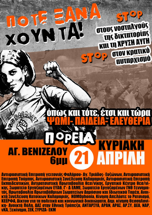 Φέτος επιδιώκουμε η 21η Απρίλη να γίνει ένας σταθμός για το αντιφασιστικό κίνημα. Να αποκρούσουμε κάθε φιλοχουντική κι αντιδημοκρατική προπαγάνδα. Να βγούμε στους δρόμους και να φωνάξουμε προς κάθε κατεύθυνση τα επίκαιρα συνθήματα «Ποτέ ξανά φασισμός» και «Ψωμί- Παιδεία- Ελευθερία». Καλούμε όλους κι όλες, τις αντιφασιστικές συνελεύσεις, τα σωματεία εργαζομένων, τους φοιτητικούς συλλόγους, τις τοπικές επιτροπές κατοίκων, τις οργανώσεις, τα κόμματα και τους χώρους των κινημάτων να συμμετέχουν ενεργά στην