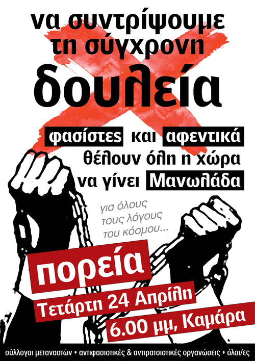 Οργιζόμαστε μπροστά στο εφιαλτικό πρόσωπο του φασισμού, του ρατσισμού και της εκμετάλλευσης. Οργιζόμαστε με τις επιθέσεις εναντίον των μεταναστών, επιθέσεις που στρέφονται ενάντια σε ολόκληρη την εργατική τάξη. Οργιζόμαστε με το δολοφονικό χέρι των αφεντικών που το οπλίζει ένα κράτος μίσους, αδικίας και εργασιακής βαρβαρότητας, ένα κράτος που χτίζει στρατόπεδα συγκέντρωσης και ψάχνει αποδιοπομπαίους τράγους.