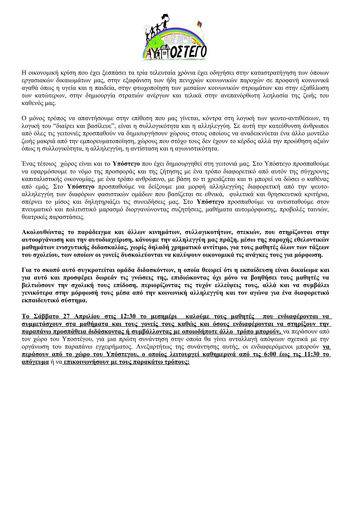 Το Σάββατο 27 Απριλίου στις 12:30 καλούμε τους μαθητές που ενδιαφέρονται να συμμετάσχουν στα μαθήματα αλληλεγύης που ξεκινούν στοω χώρο αλληλεγγύης και δράσης ΥΠΟΣΤΕΓΟ,τους γονείς τους καθώς και όσους ενδιαφέρονται να στηρίξουν την παραπάνω προσπάθεια διδάσκοντας ή συμβάλλοντας με οποιοδήποτε άλλο τρόπο μπορούν.