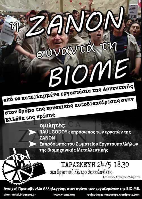 Στα πλαίσια της ευρωπαϊκής περιοδείας του ο Raul Godoy, εκπρόσωπος των εργατών του κατειλημμένου εργοστασίου της ΖΑΝΟΝ στην Αργεντινή, επισκέπτεται τη Θεσσαλονίκη και τους εργαζόμενους της Βιομηχανικής Μεταλλευτικής. Σε μια άκρως αναμενόμενη και ενδιαφέρουσα εκδήλωση οι εργάτες από τα αυτοδιευθυνόμενα εργοστασιακά παραδείγματα θα κουβεντιάσουν και θα ανταλλάξουν εμπειρίες που θα ακουμπήσουν θεματικές από τις καταλήψεις των εργοστασίων και άλλων επιχειρήσεων, μέχρι και τα αντίστοιχα κινήματα που στηρίζουν τον κοινό αγώνα ενάντια στη φτώχεια και στην εξαθλίωση. Την Παρασκευή 24 Μάη, στη μεγάλη αίθουσα εκδηλώσεων του ΕΚΘ (Ολύμπου και Αριστοτέλους) στις 18.30.